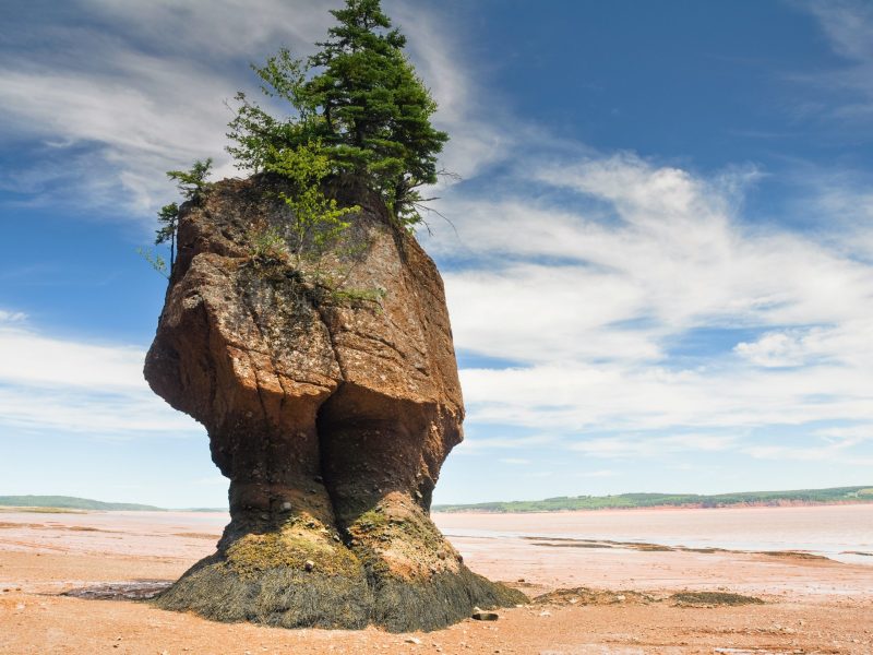 Cada día, más de 100 mil millones de toneladas de agua de mar entran y salen de la Bahía de Fundy, que se extiende entre Nueva Brunswick y Nueva Escocia, ¡eso es más que todos los ríos de agua dulce del mundo combinados! La marea es tan poderosa que expone fósiles antiguos en las paredes rocosas a lo largo de la costa y hace que el agua se eleve en algunos puntos a más de 50 pies. En sitios como Hopewell Rocks, NB, puedes navegar en kayak alrededor de las islas de macetas, luego caminar en el fondo del océano unas horas después.